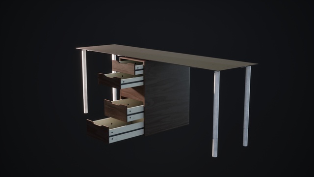 - Configurable materials: Materials are configurable to change the colour, add light or dark dust and the glass desk, drawers, lamp, and mirror have fingerprints.
